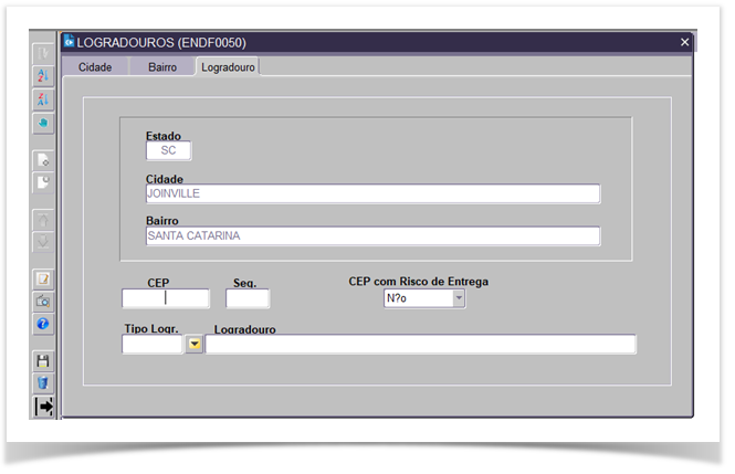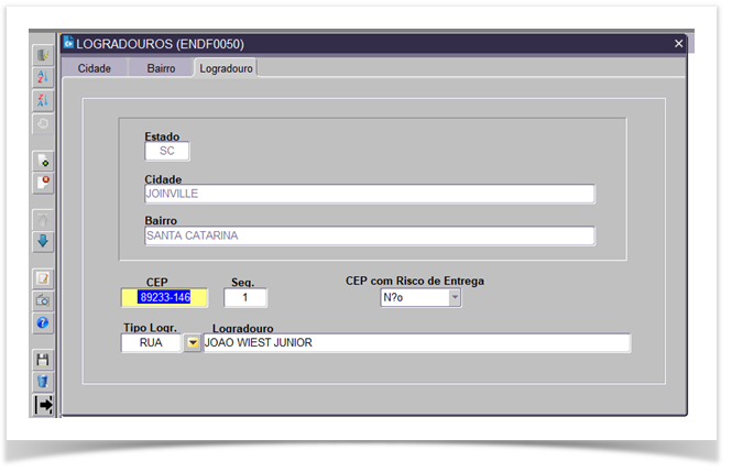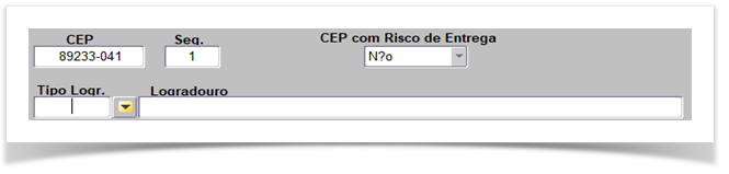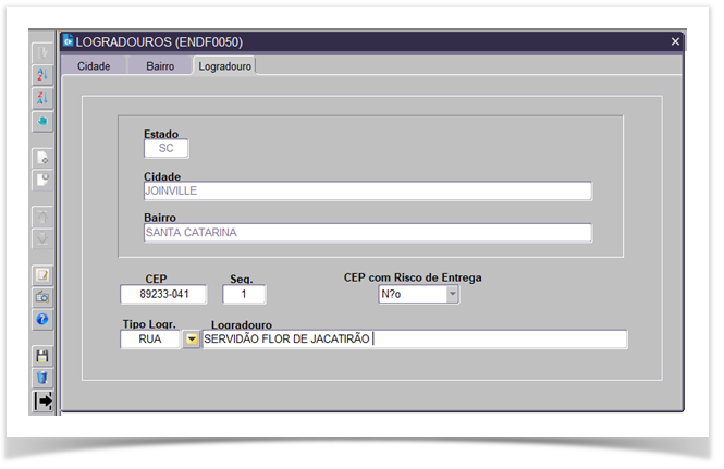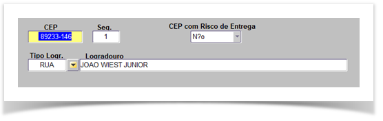20. Ao informar a Sequência e pressionar Enter, informar Tipo Logradouro. ‘Rua ou Avenida’;