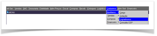 1. Acessar Cadastros -> Auxiliares -> Logradouros;