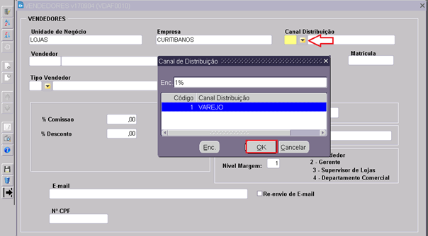 4. Ao selecionar o Canal Distribuição, digitar o nome completo vendedor;