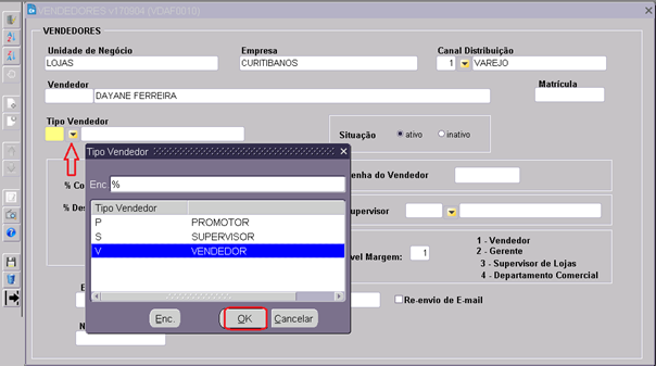 5. Clicar Tipo Vendedor, selecionando Supervisor ou Vendedor clicar OK;