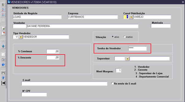 ERP: Menu Cadastros/ Vendas /Vendedor (VDAF0010): Agora será feito o cadastro de senha de desconto (ou negociação como a loja se refere) utilizada na venda assistida (VA).