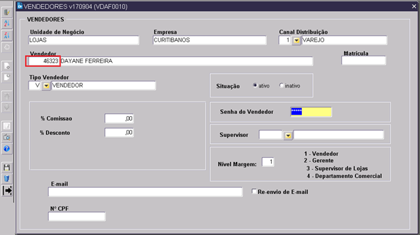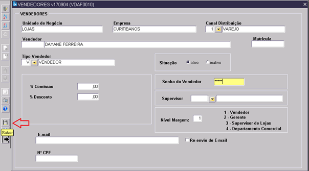 1. Para consultar, clicar no ícone , informar os dados importantes como principalmente o código vendedor e/ou nome e, em seguida, concluir a consulta clicando no ícone  para que o sistema retorne os dados encontrados. Caso, retorne, utilizar a tecla seta para baixo do TECLADO para ver se existe mais de um cadastro e se o cadastro já está com os dados corretos principalmente a loja em que o mesmo está trabalhando;