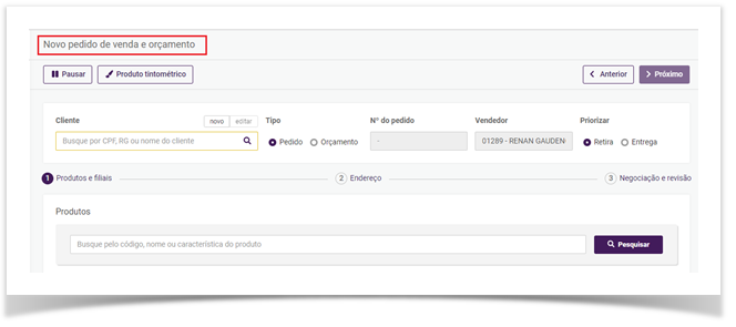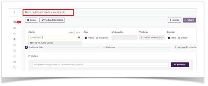 18. Verifique que apresentou a tela Pedido de venda e orçamento, sendo assim o vendedor pode iniciar a venda digitando o código do cliente;