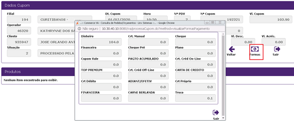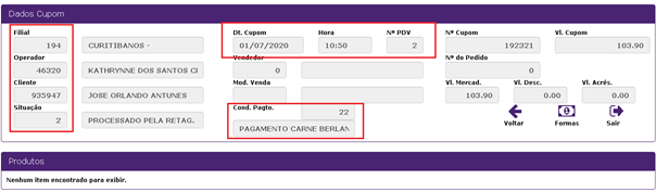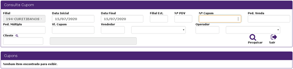6. Ao clicar Consulta->Consulta Cupom, apresentará a tela;