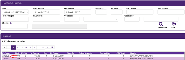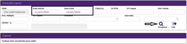 7. Para realizar a pesquisa é preciso informar alguns dados. Exemplo: data do cupom ou código do cliente ou pedido venda, etc. Ou todas as informações necessárias que saiba para a pesquisa do cupom;
