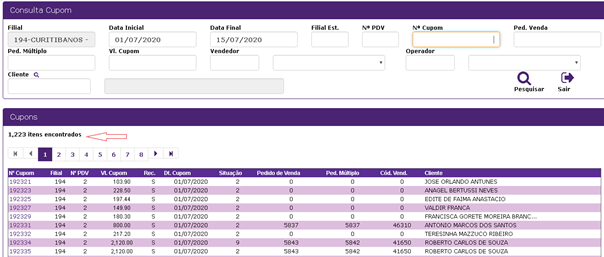 9. Ao clicar Pesquisar, irá apresentar todos os cupons registrados entre as datas informadas;