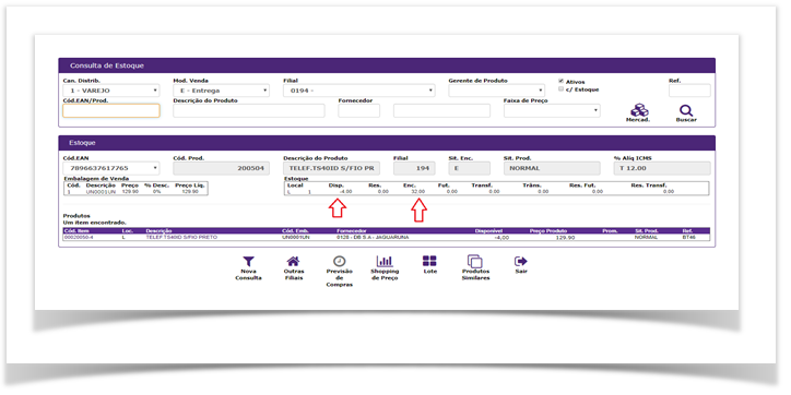 7. Digitar o código do produto de interesse em saber se tem no estoque;