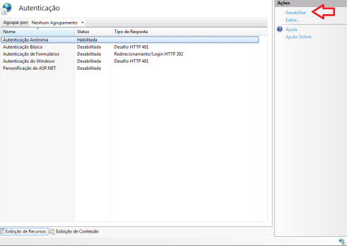 Clicar em Autenticação Anônima o no painel de ações (do lado direito) clicar em Desabilitar.
