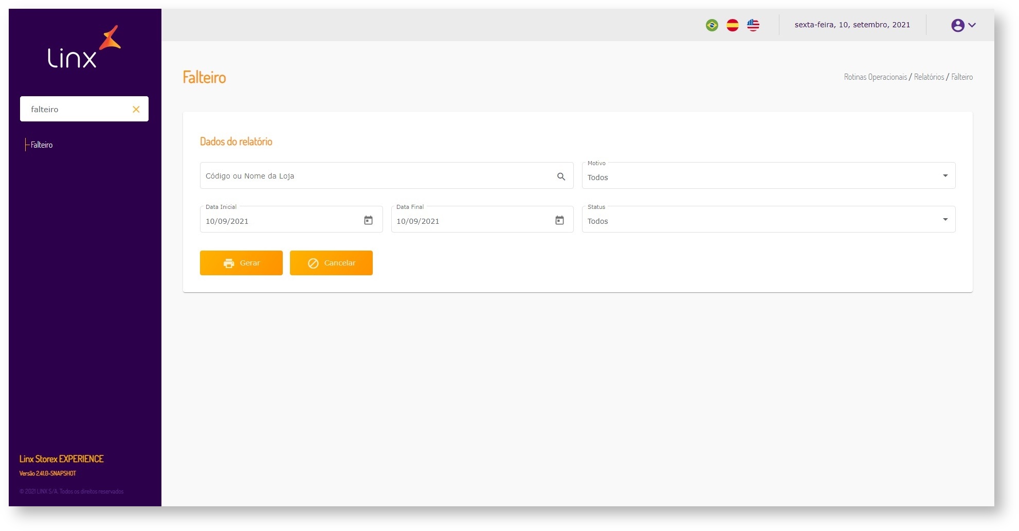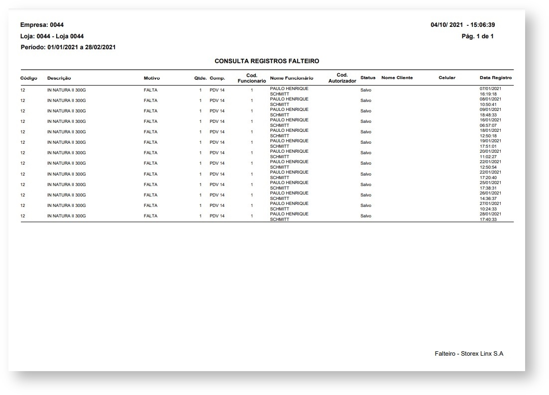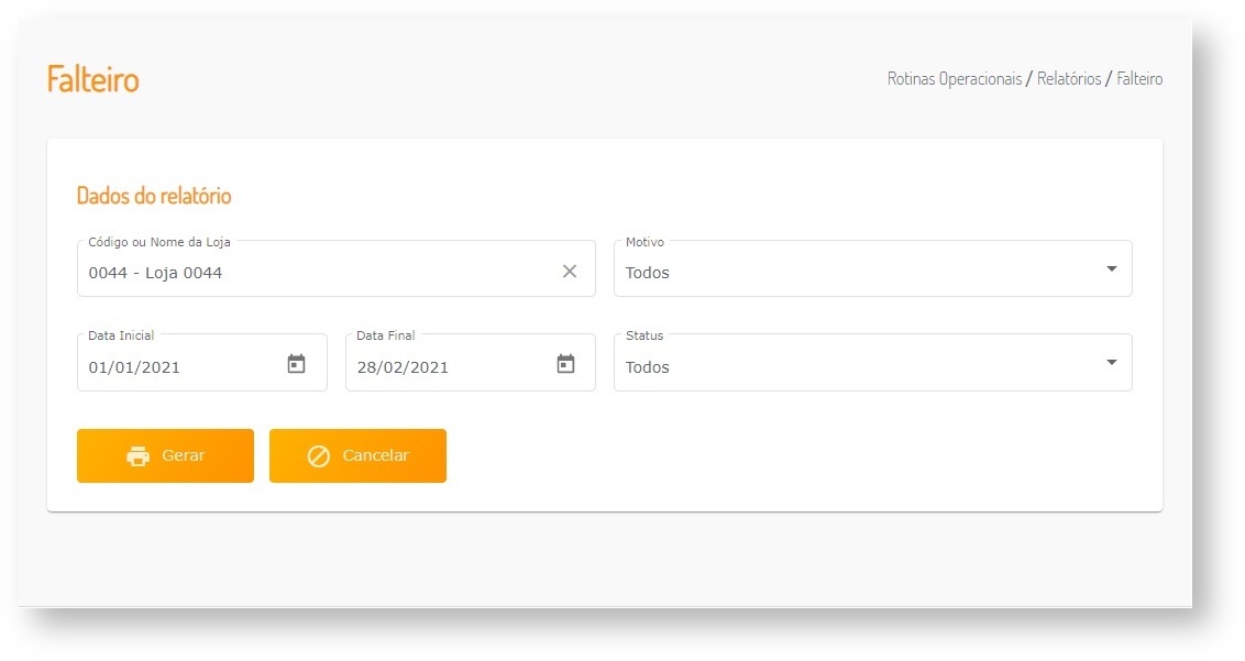 Para gerar o relatório Falteiro especifique a loja e o período. Os demais filtros são opcionais.