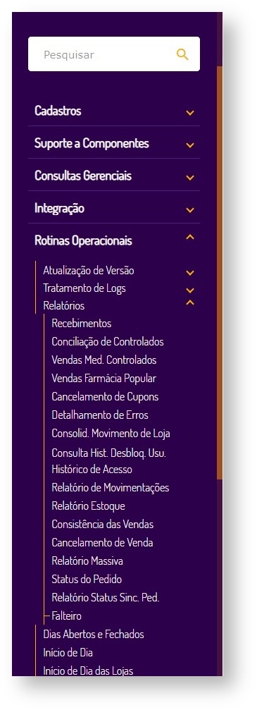 O acesso à tela Falteiro também pode ser feito através do campo Pesquisa. Para isto, preencha o box com "falteiro".