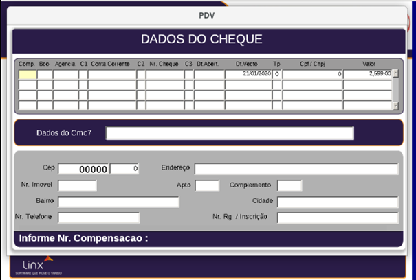 1. Para realizar pagamentos com cheque selecionar;