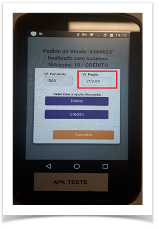 6. Se o pagamento for Parcial, é preciso informar o valor no campo: VL_Pagto e, em seguida, selecionar a modalidade: Débito ou Crédito;