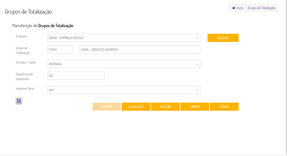 Em Grupos de Totalização, cadastrar um novo grupo:
