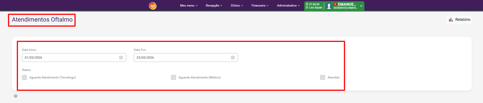 1) Acesse Recepção →  Relatórios →  Atendimentos Oftalmo