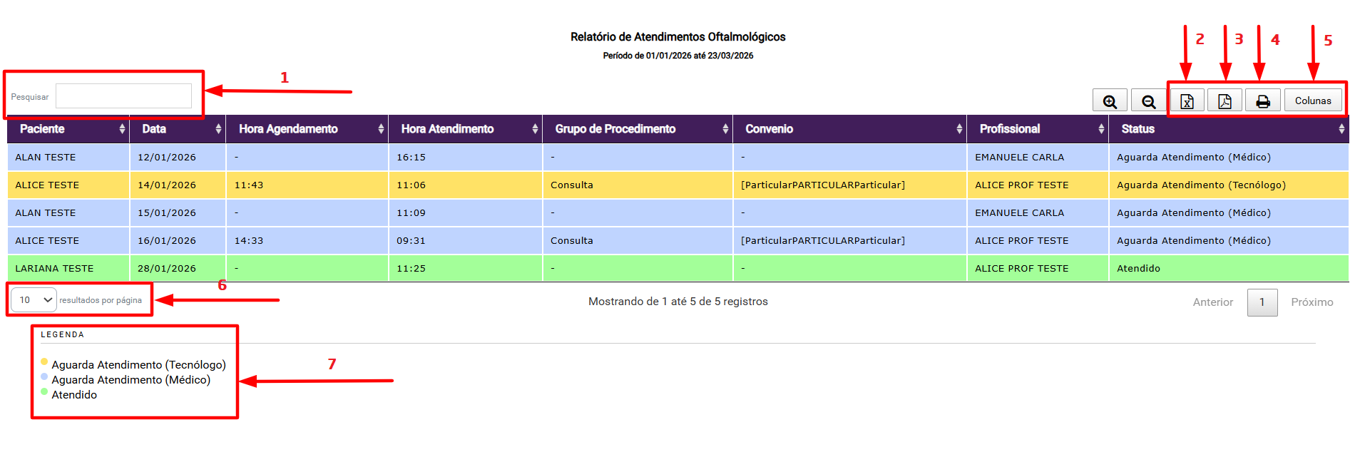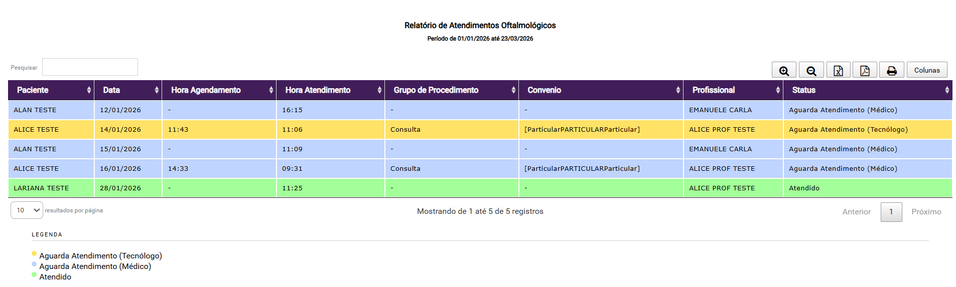 O Relatório de Atendimentos Oftalmo permite visualizar e analisar os atendimentos oftalmológicos realizados no sistema.