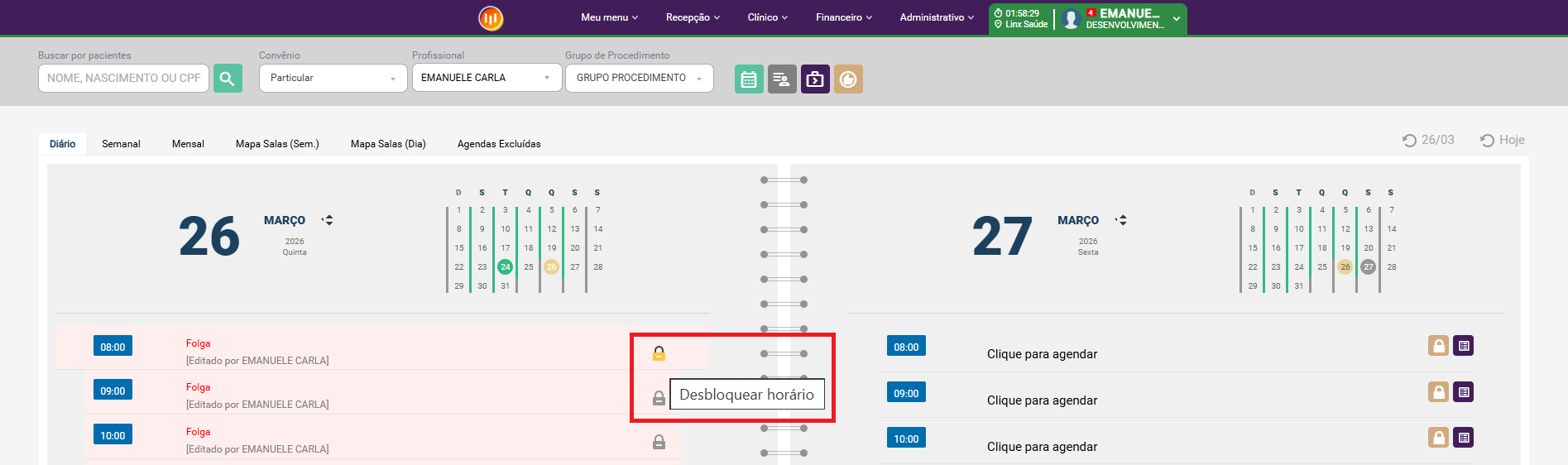 2)  Na agenda do profissional que tem dias bloqueados, que foram inclusos via menu Recepção → Bloquear Agenda, clique no ícone de cadeado.