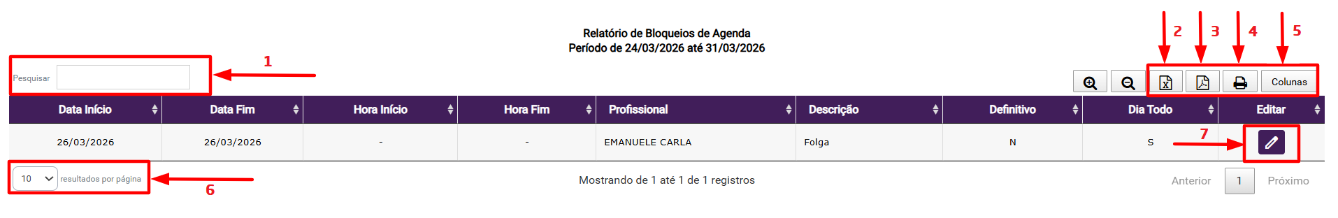 2) No campo de busca, digite o nome do profissional ou a descrição do bloqueio (ex: Férias).