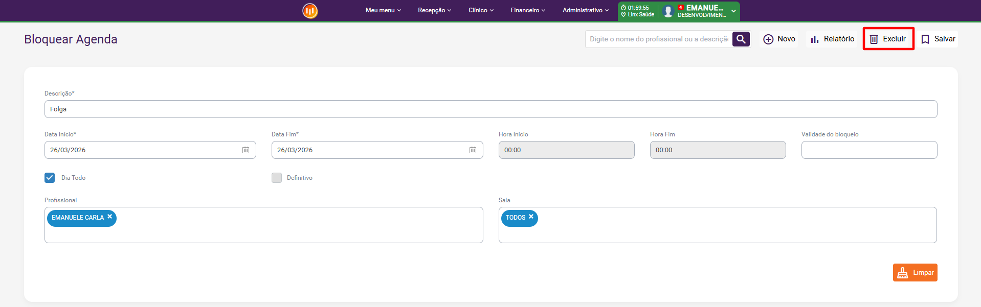 5)  Após confirmar clicando em "Sim", o usuário é redirecionado para a tela Bloquear Agenda, na qual o registro do bloqueio já vem carregado. Para fazer a exclusão do bloqueio, é só clicar no botão .