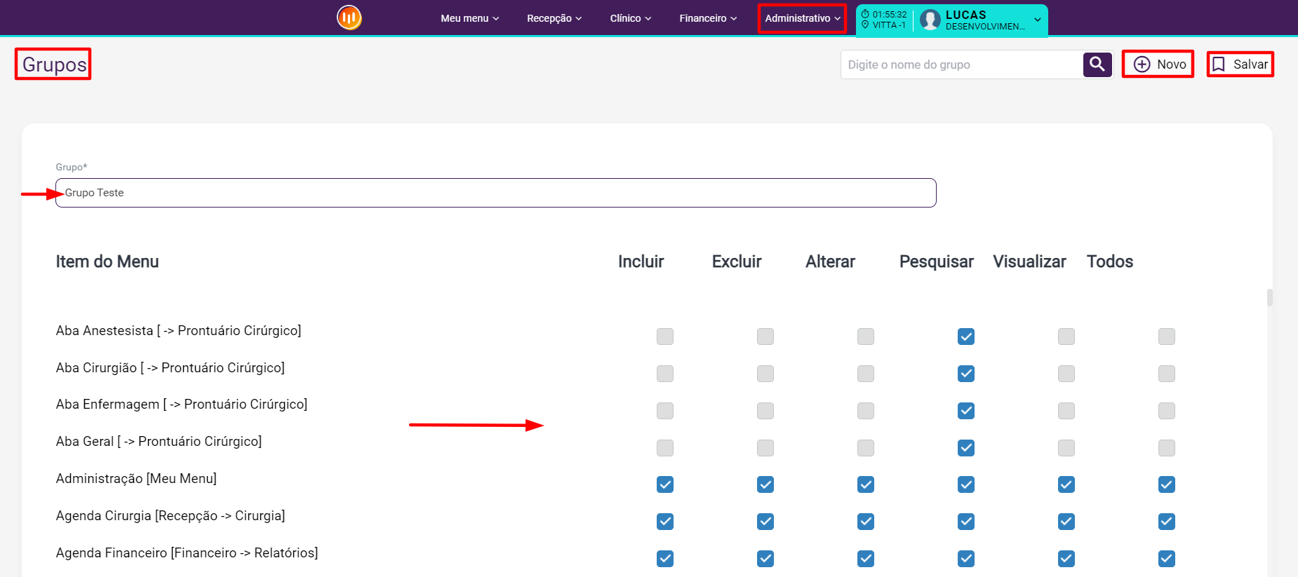 2) Clique na opção “novo”, a tela ficará em branco, preencha o campo obrigatório “grupo” em seguida selecione todas opções de acesso ao sistema daquele determinado grupo.