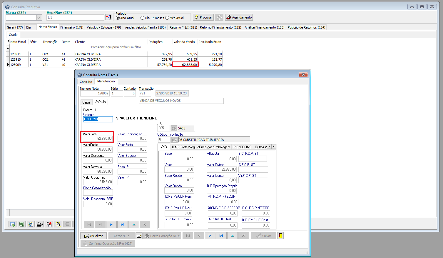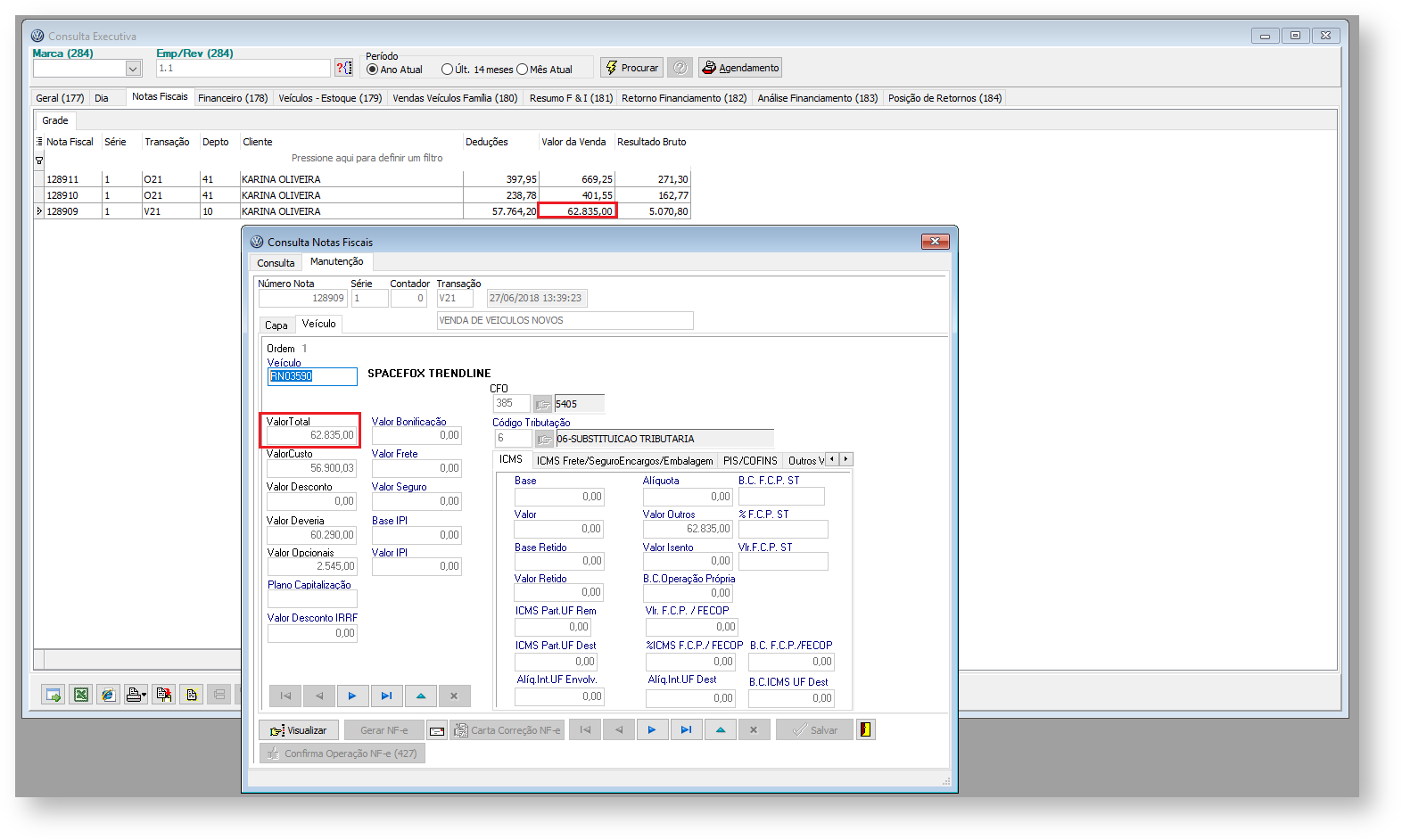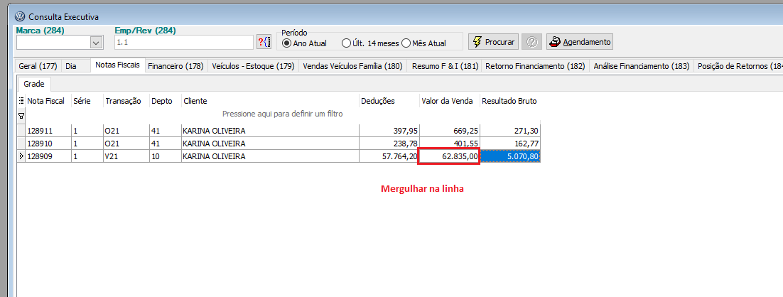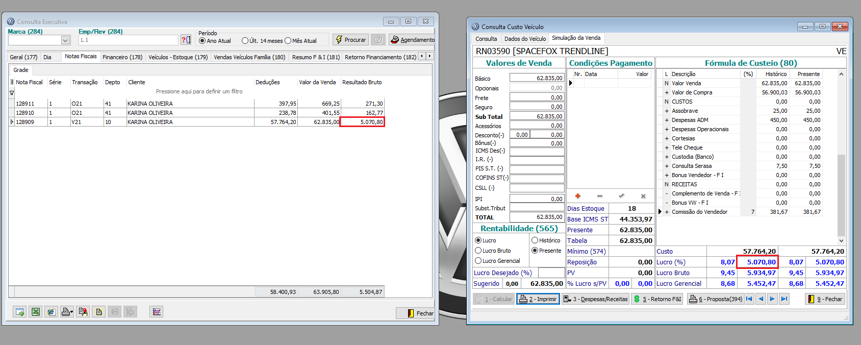 Nas telas abaixo, os campos da coluna Resultado Bruto (Consulta Executiva) e Lucro (%) (Consulta Custo Veículo) estão com o mesmo valor, nesse caso, 5.070,80.