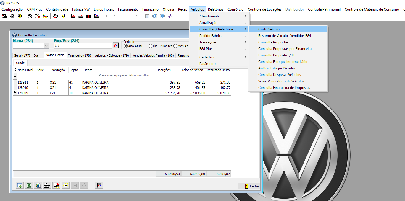 Para confirmar o valor que apresenta na coluna Resultado Bruto (na Consulta Executiva), acesse o menu: Veículos > Consultas / Relatórios > Custo Veículo.