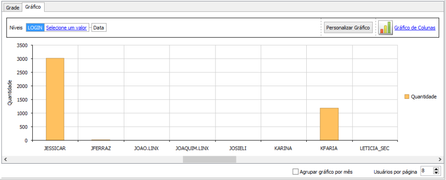 Marcando a opção "Agrupar gráfico por mês" será mostrado todos os meses pesquisados no gráfico por usuário e a opção "Usuários por página" configura quantos usuários serão mostrados por página.