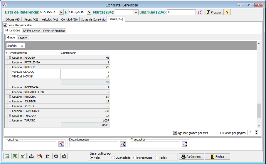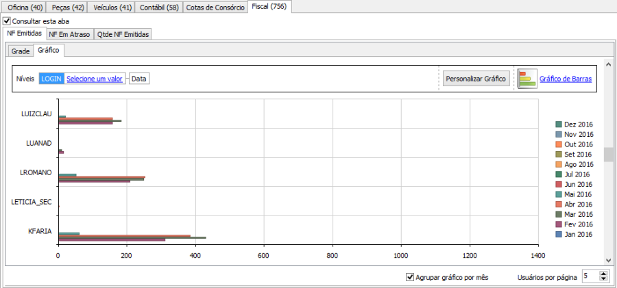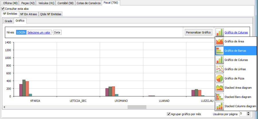 Nesta mesma tela, sub-aba "Gráfico", existe um demonstrativo gráfico da quantidade de notas emitidas/recebidas por usuário.