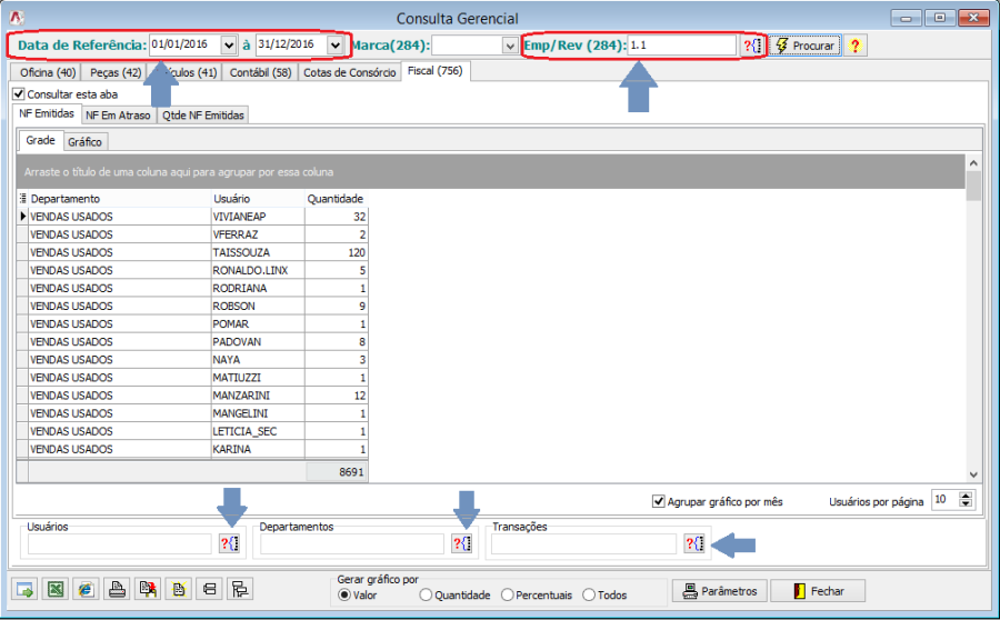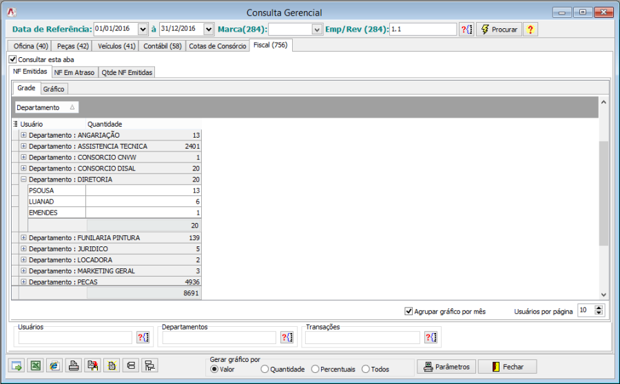 Esta nova aba possibilita que o usuário tenha um controle da quantidade e valor das notas emitidas/recebidas, podendo comparar o volume entre usuários, departamentos, filiais e tipos de transação.