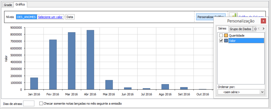 Clicando no botão "Personalizar Gráfico" o usuário poderá selecionar a opção "Valor" mostrando um gráfico por valor atrasado.
