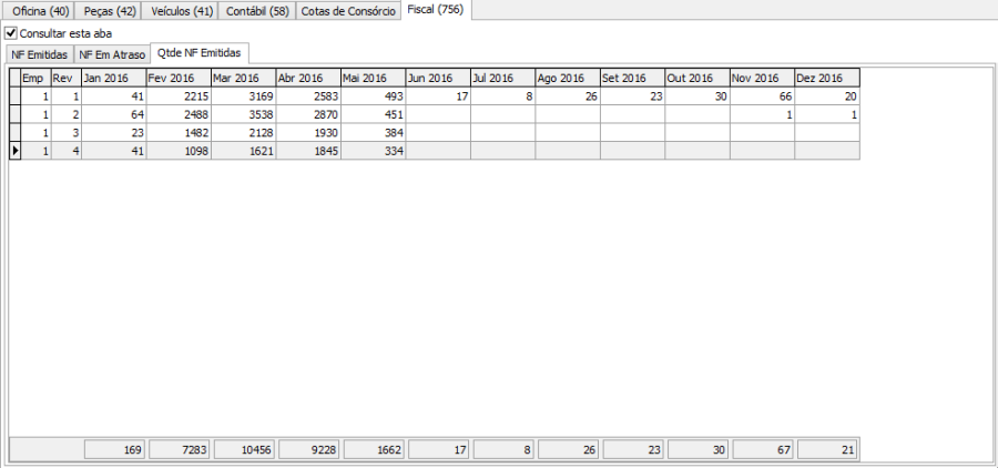 Na aba "Qtde NF Emitida", o usuário poderá verificar a quantidade de notas emitidas/recebidas por filial dentro do período informado.