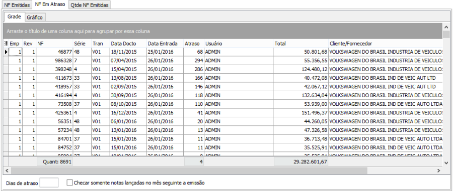 Na aba "NF Em Atraso", o usuário poderá verificar todas as notas emitidas/recebidas e a quantidade de dias entre a emissão e o lançamento da nota.