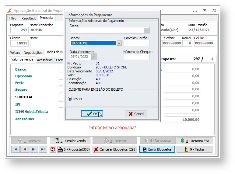 Ao realizar a aprovação gerencial de uma proposta com boleto na sua condição de pagamento, é possível realizar a emissão dos boletos.