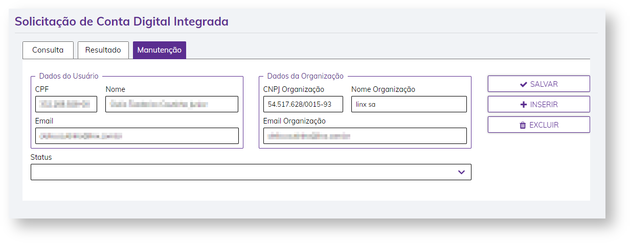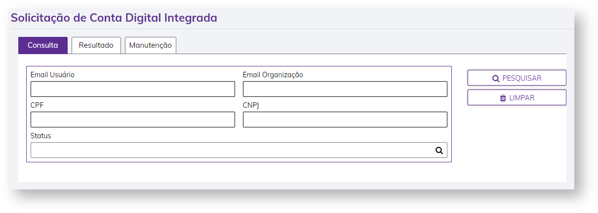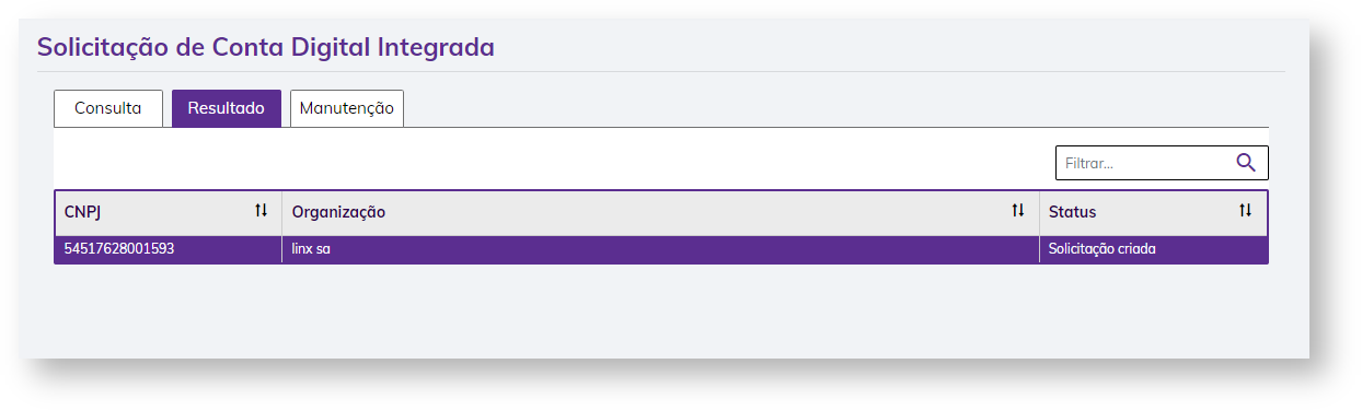Através do menu: Financeiro>Integração> Conta Digital Integrada > Contas> Solicitação, é possível criar uma solicitação através da aba Manutenção e Consultar a situação da solicitação de conta.