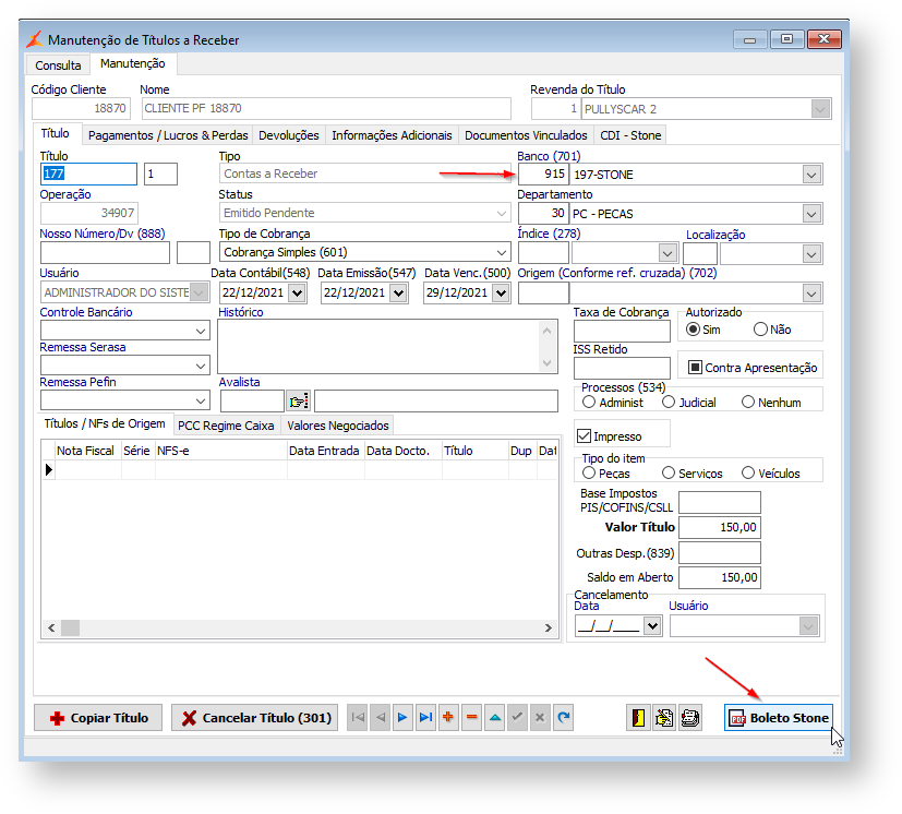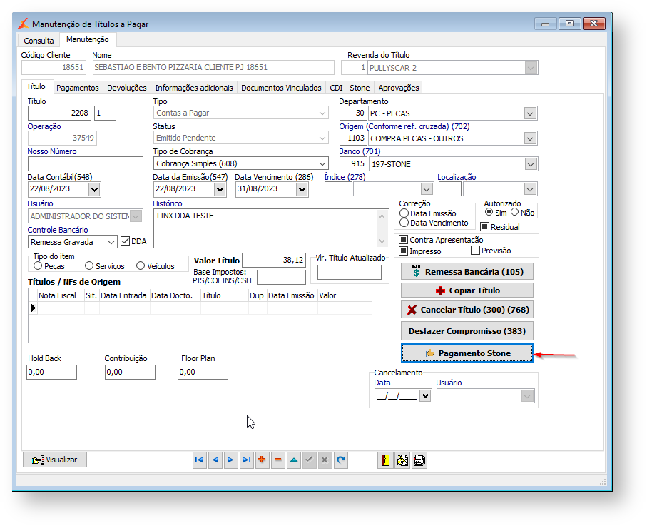 Após fechar a tela, ao voltar para a manutenção de títulos a receber, será habilitado o botão "Pagamento Stone" caso o banco selecionado no campo "Banco Remessa" tenha vinculo com uma conta Stone.