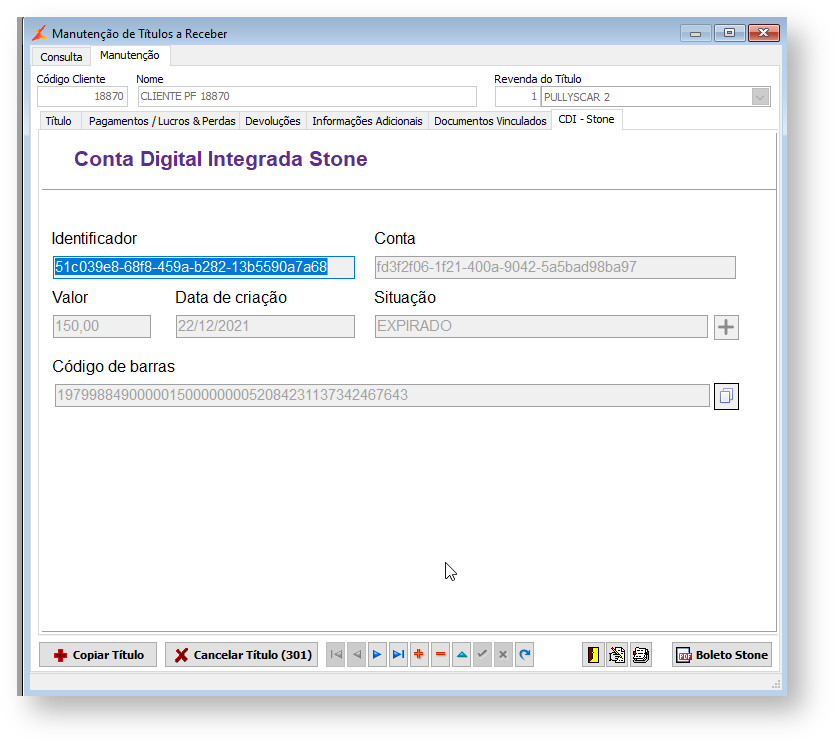 Ao clicar no botão "Boleto Stone", o boleto deve ser gerado. Após isso, é possível visualizar algumas informações sobre o boleto na aba CDI - Stone.