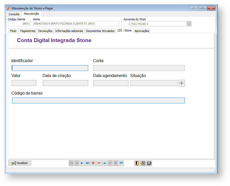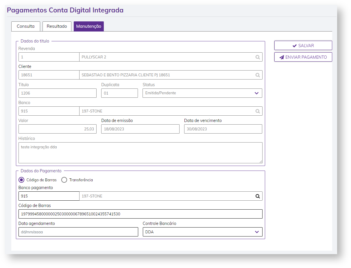 Na tela de manutenção, preencha os valores de código de barras e banco de pagamento. Após isso, será habilitado o botão "Enviar Pagamento", que ao ser clicado, criará o pagamento via Conta Digital Integrada Stone ;