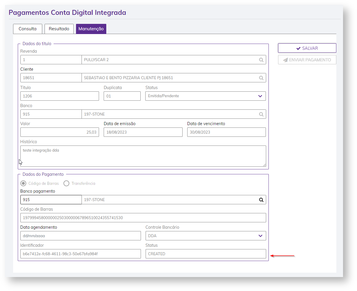 Também é possível apenas salvar os dados do pagamento, para criação futura. Após a criação de um pagamento, na caixa de Dados do Pagamento, será mostrado a situação do pagamento Conta Digital Integrada Stone, e seu identificador.