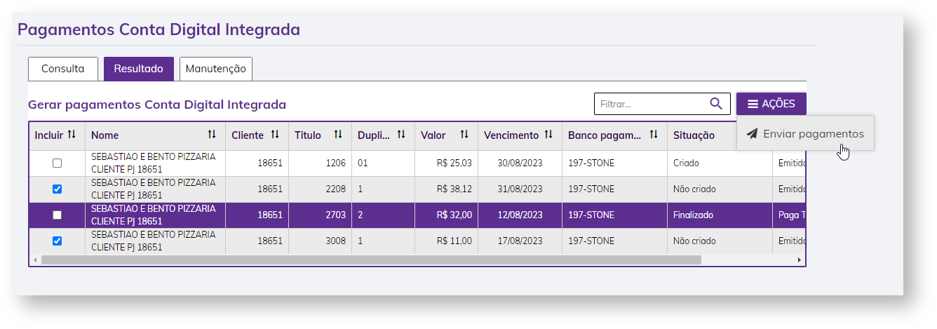 Também é possível gerar múltiplos pagamentos, desde que os títulos tenham um código de barras já cadastrado. Para isso vá até o menu Financeiro > Integração > Conta Digital Integrada > Pagamentos. Selecione os filtros desejados e clique no botão procurar. Na tela de resultado clique no botão "Ações", em seguida no botão "Enviar Pagamentos".