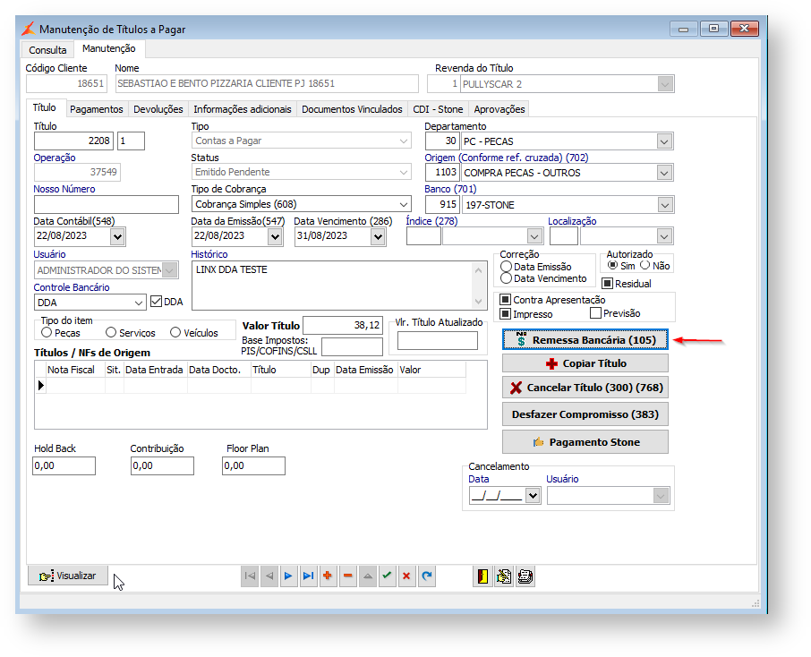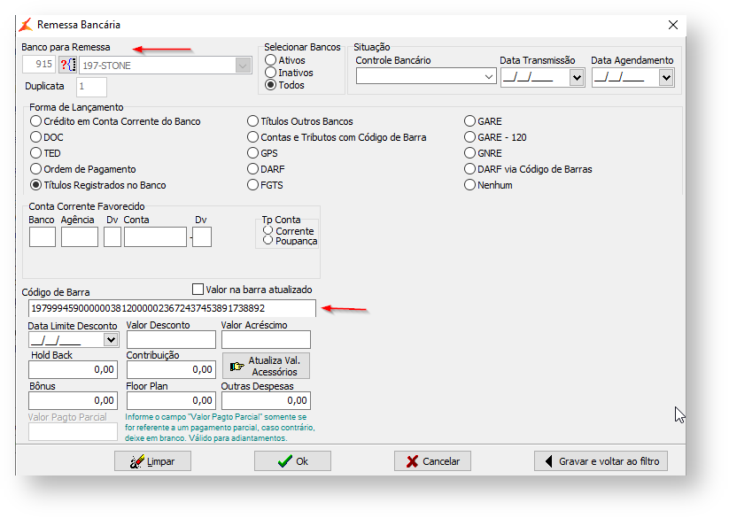 Caso o pagamento já tenha código de barras e banco de pagamento vinculado, clique no botão "Pagamento Stone". Caso contrario, clique no botão "Remessa Bancária (105)".
