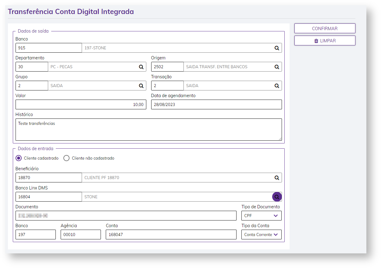 Dados de entrada - Para qual cliente será realizado a transferência.