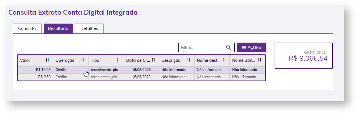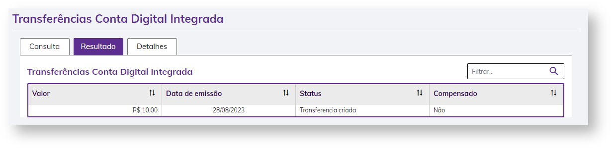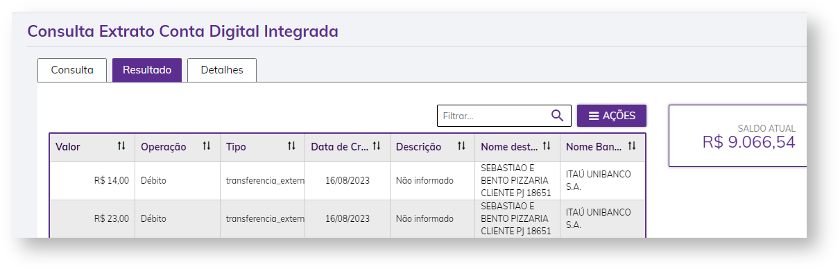 Em Financeiro > Integração > Conta Digital Integrada > Transferência > Consulta