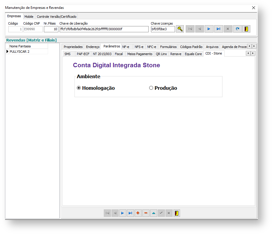 IMPORTANTE: Para utilizar a integração corretamente, é necessário definir o ambiente de produção SEMPRE na Empresa e Revenda 1.1. Caso contrário, o ambiente permanecerá em modo de "Homologação", mesmo que seja definido em outra Empresa e Revenda.