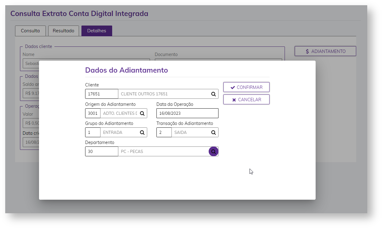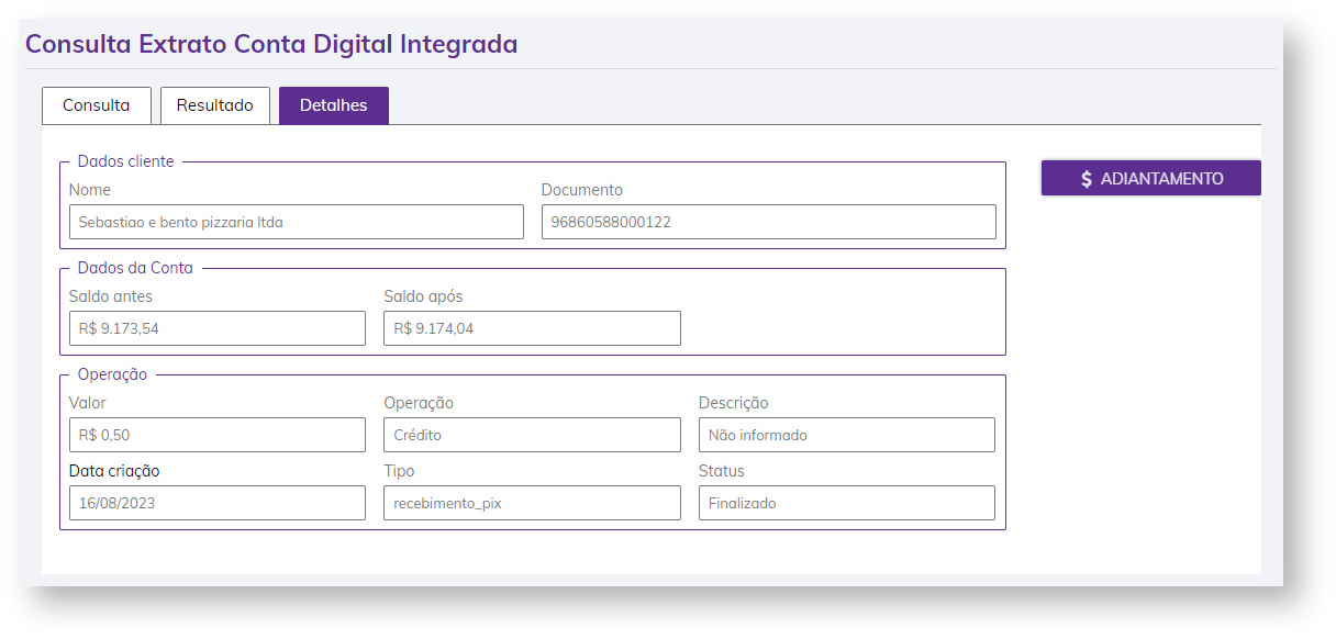 Para resultados de consulta de extrato com o "TIPO" de operação que seja "recebimento_pix" como mostra tela abaixo, após selecionar um registro será habilitado um botão de Adiantamento.