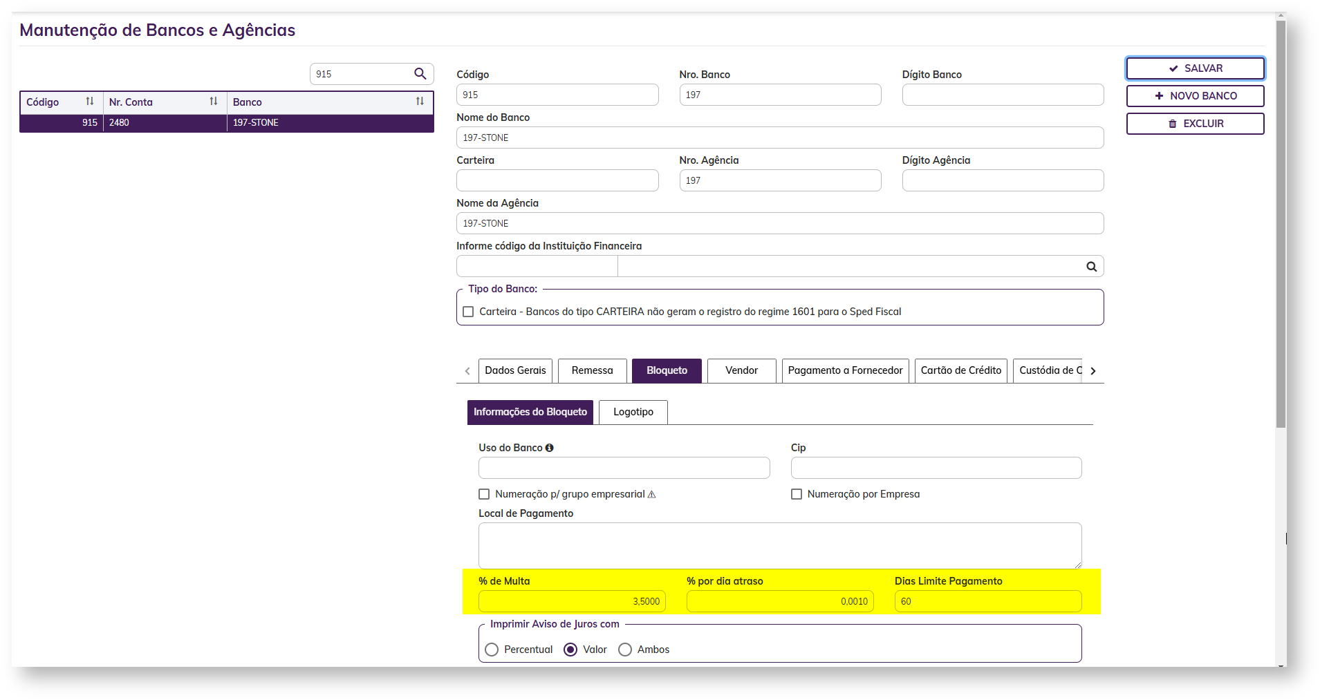 % de Multa - Esse campo deve ser preenchido o valor que será aplicado de multa sobre o valor do boleto;