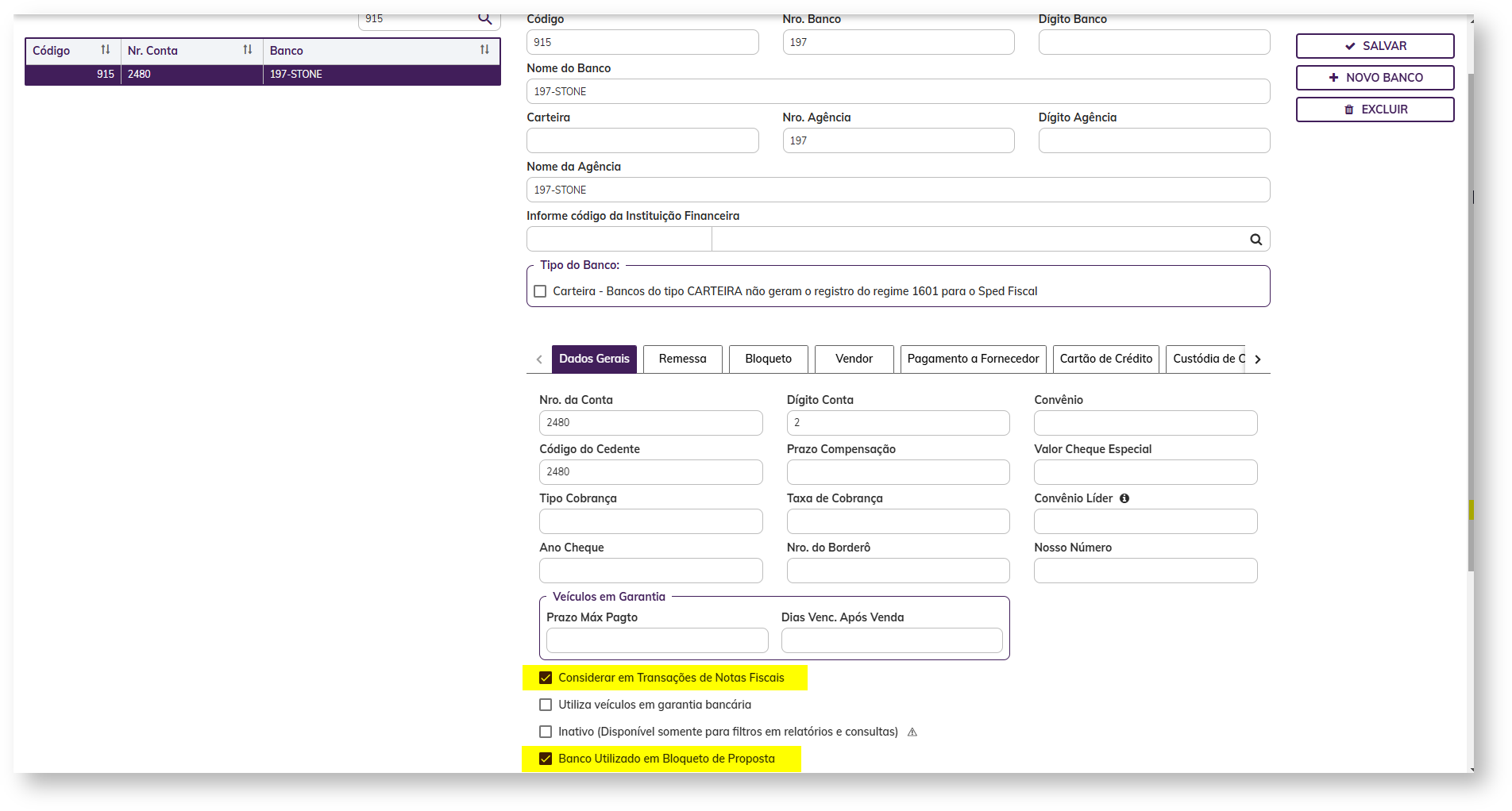 - Banco Utilizado em Bloqueto de Proposta, para utilizar na aprovação gerencial de proposta de veículos.