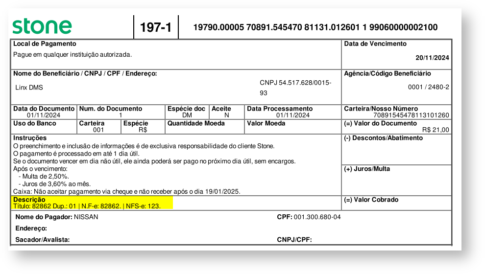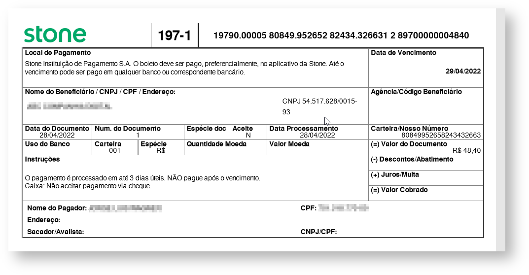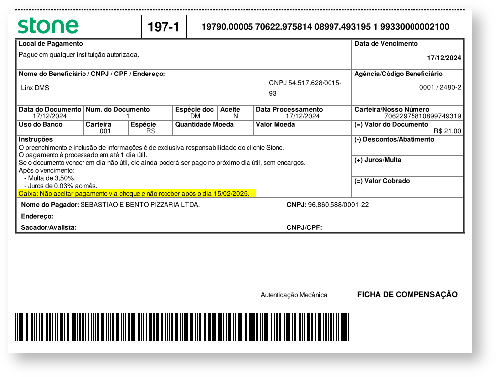 OBS: NÃO é possível preencher a instrução de pagamento, o boleto é gerado no padrão Stone.
