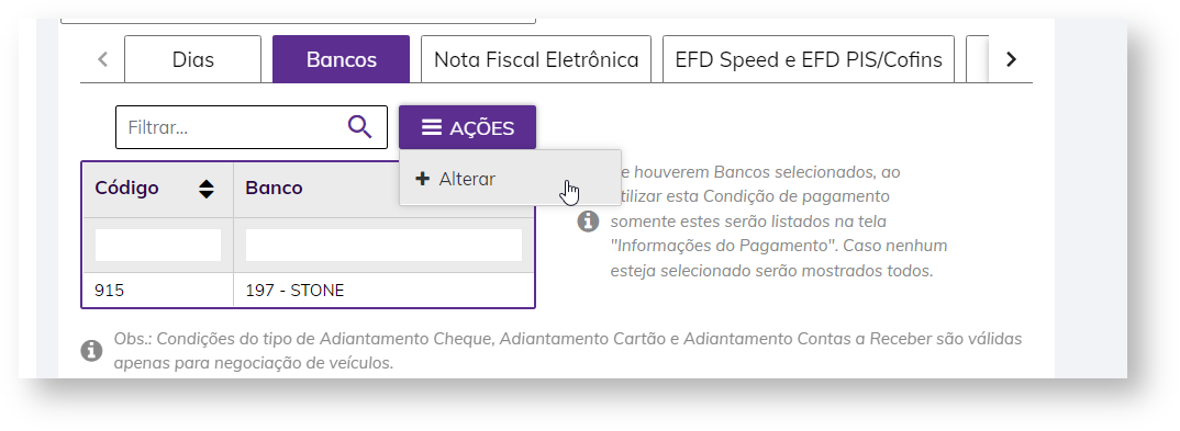No rodapé dessa tela selecionar o banco que deseja utilizar para essa condição de pagamento: