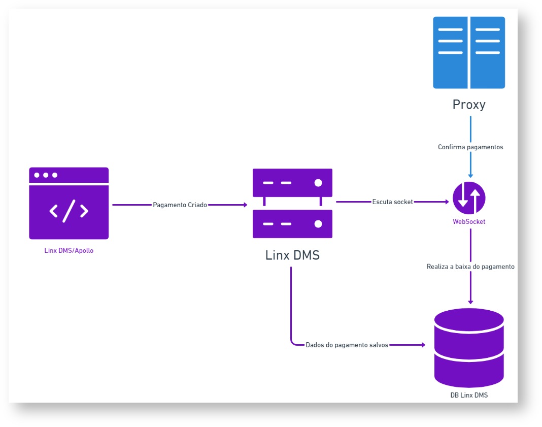 Para tornar o processo de pagamentos mais dinâmico, foi criado a baixa automática de pagamentos via Web Socket. O processo funciona da seguinte forma: