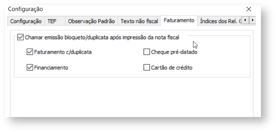 OBS: Verifique se está parametrizado corretamente, Abra o Frente de Caixa, e no menu Arquivo> Configuração Aba Faturamento, se a opção 'Chamar emissão de Bloqueto/duplicada após impressão da nota fiscal' está marcada: