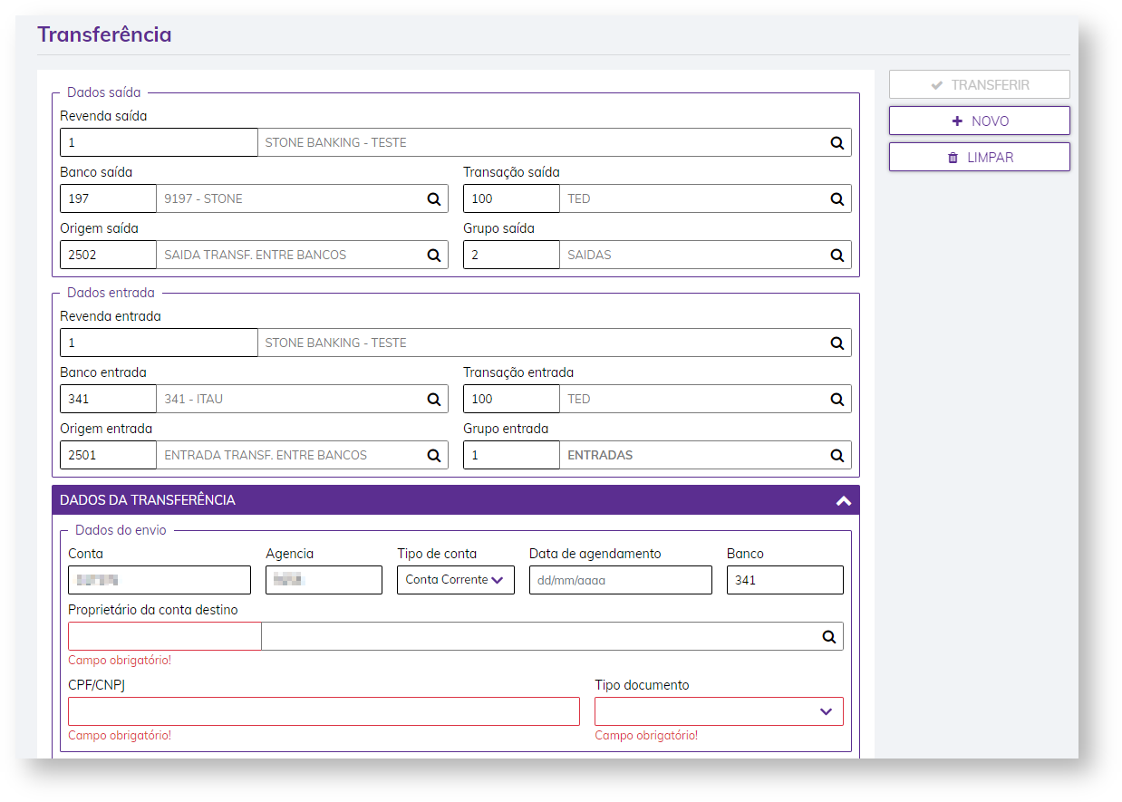 Menu: Financeiro > Integração > Conta Digital Integrada > Transferências> Realizar Transferência